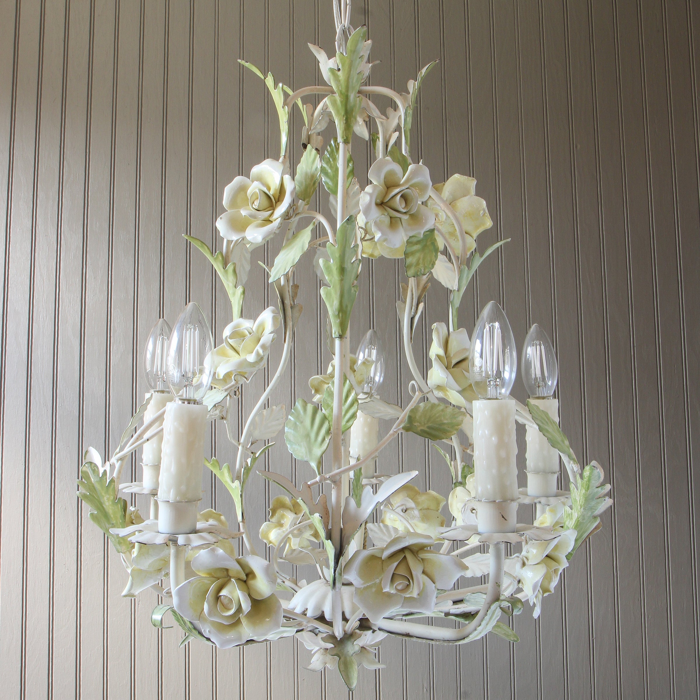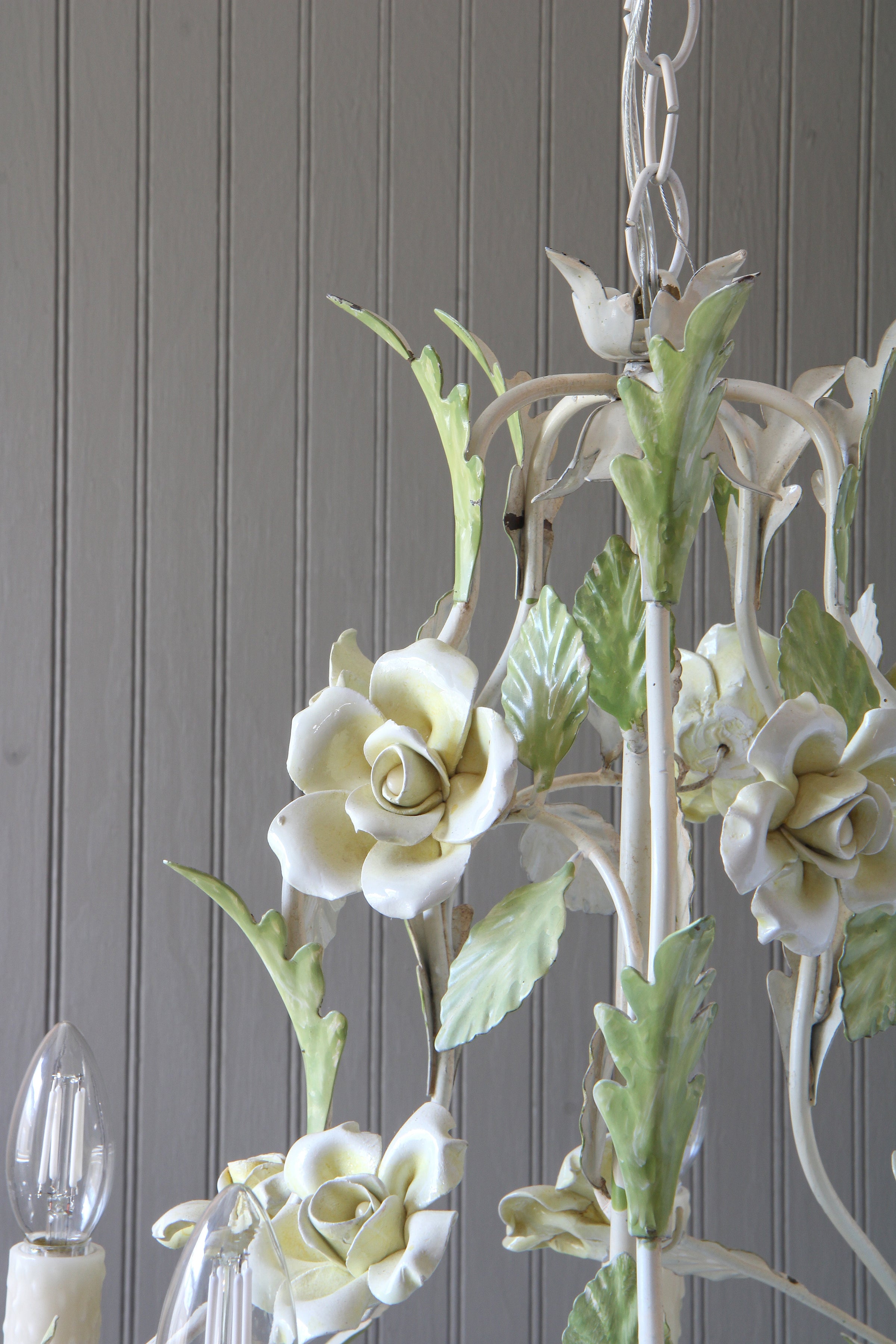 This vintage Italian chandelier is a romantic blend of hand-painted tole leaves and delicate porcelain roses, evoking timeless European charm. Crafted in the mid-20th century, it features five candelabra arms with new wax-drip candle sleeves, surrounded by sculpted metal vines and creamy ivory blossoms with soft green foliage.